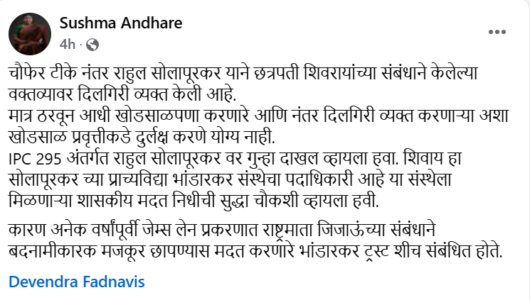 सुषमा अंधारे यांनीही राहुल सोलापूरकरवर कारवाईची मागणी केली आहे. चौफेर टीके नंतर राहुल सोलापूरकर याने छत्रपती शिवरायांच्या संबंधाने केलेल्या वक्तव्यावर दिलगिरी व्यक्त केली आहे. मात्र ठरवून आधी खोडसाळपणा करणारे आणि नंतर दिलगिरी व्यक्त करणाऱ्या अशा खोडसाळ प्रवृत्तीकडे दुर्लक्ष करणे योग्य नाही. IPC 295 अंतर्गत राहुल सोलापूरकर वर गुन्हा दाखल व्हायला हवा. शिवाय हा सोलापूरकर च्या प्राच्यविद्या भांडारकर संस्थेचा पदाधिकारी आहे या संस्थेला मिळणाऱ्या शासकीय मदत निधीची सुद्धा चौकशी व्हायला हवी. कारण अनेक वर्षांपूर्वी जेम्स लेन प्रकरणात राष्ट्रमाता जिजाऊंच्या संबंधाने बदनामीकारक मजकूर छापण्यास मदत करणारे भांडारकर ट्रस्ट शीच संबंधित होते. असं सुषमा अंधारे म्हणाल्या आहेत.