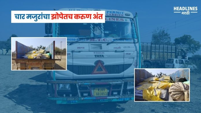 छत्रपती संभाजीनगर-मालेगाव महामार्गावरील टूनकी शिवारातील बळीराजा ढाब्याजवळ अवजड लोखंडी प्लेट वाहतूक करणाऱ्या ट्रक चालकाने अचानक ब्रेक दाबल्याने प्लेटा सरकून त्याखाली दबून याच गाडीत मागे झोपलेल्या मध्यप्रदेश येथील चौघांचा मृत्यू झाल्याची घटना सोमवारी दि.२७ रोजी रात्री १०:३० वाजेच्या सुमारास घडली.
