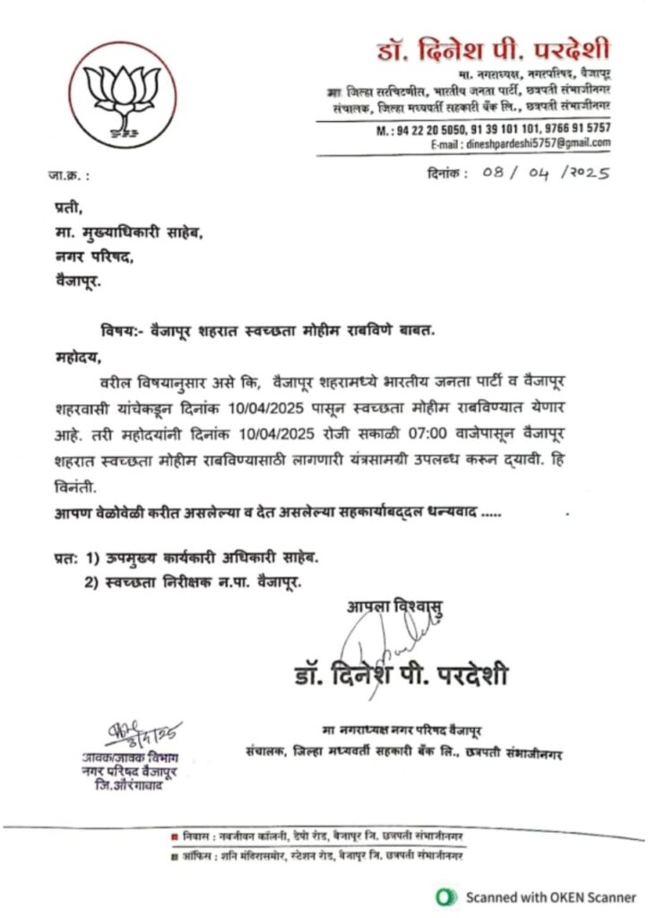प्रशासनाच्या नाकर्तेपणाला कंटाळून आता लोकप्रतिनिधी स्वत: मैदानात उतरले आहेत. भारतीय जनता पक्षाचे (भाजपा) माजी नगराध्यक्ष डॉ. दिनेश परदेशी यांनी स्वच्छता मोहिमेची घोषणा केली आहे. १० एप्रिलपासून भाजपाच्या वतीने शहरात स्वच्छता अभियान राबवलं जाणार आहे. याबाबत त्यांनी मुख्याधिकाऱ्यांना पत्र देऊन माहिती दिली आहे. या मोहिमेत भाजपाचे कार्यकर्ते आणि स्वयंसेवक सहभागी होणार आहेत.